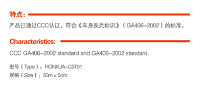 特點:產(chǎn)品已通過CCC認證,符合《車身反光標識》(GA406-2002)的標準。